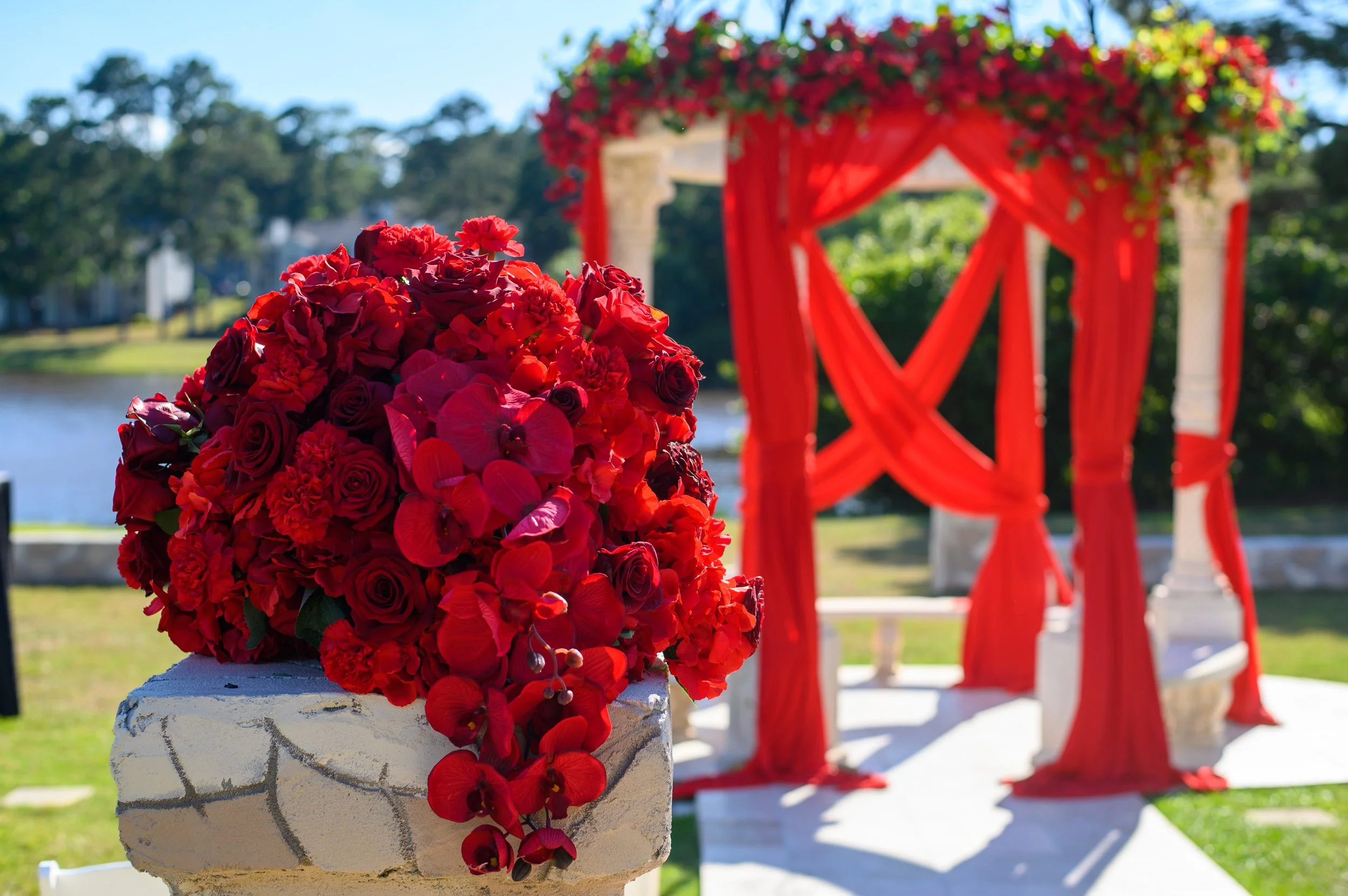 Red Passion combines the intense vibrancy of deep crimson with the luxurious warmth of gold, creating a dramatic atmosphere of romantic opulence and bold sophistication. The design features sumptuous red rose arrangements in varying heights, crystal candelabras, ornate gold accents, and striking black contrasts that evoke the passionate intensity of true love and the seductive allure of elegant extravagance.
